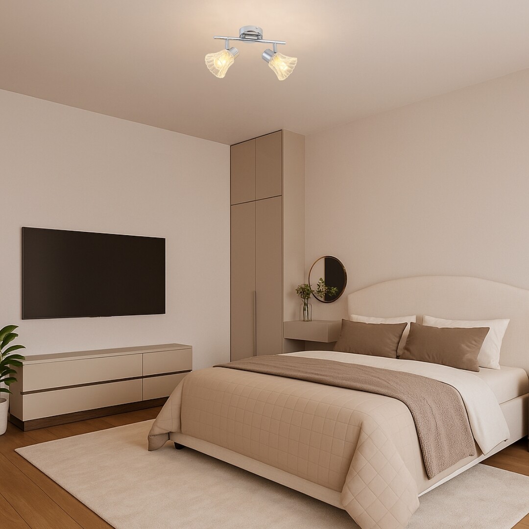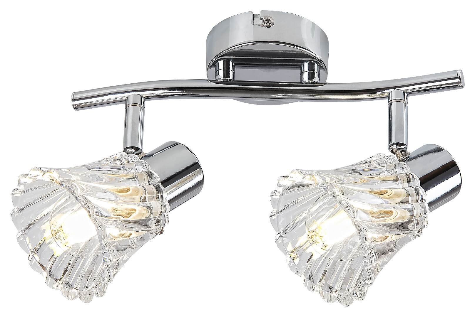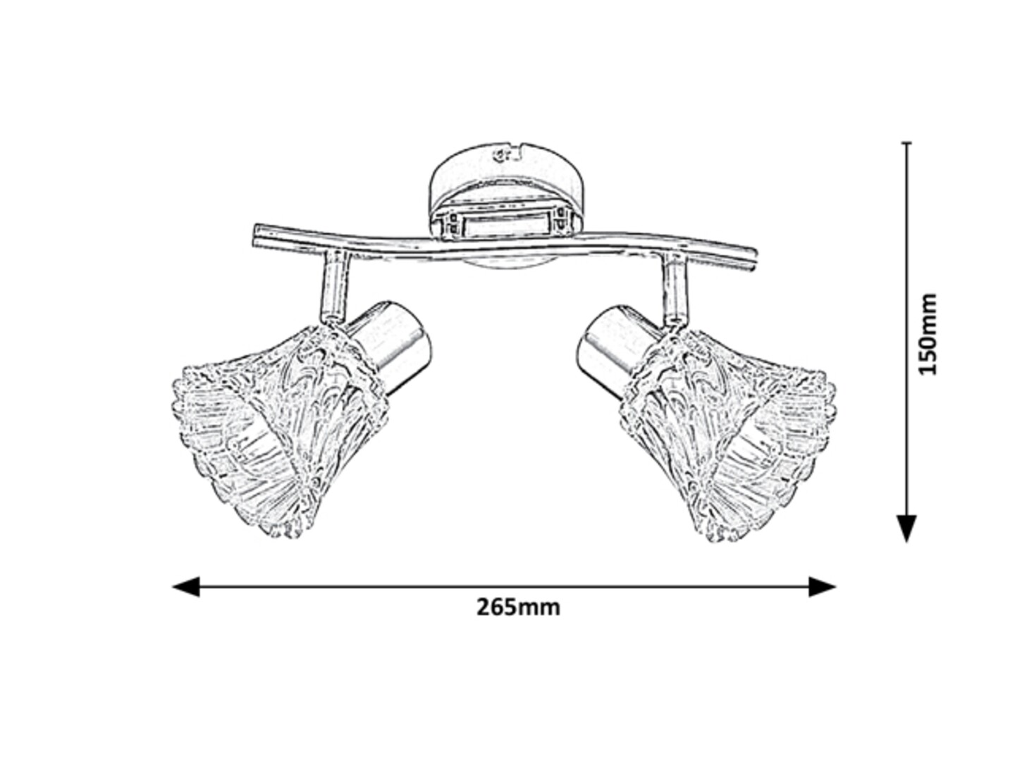 Die im klassischen Stil gefertigte 2-flammige Spotlampe Hestia wird ein elegantes Einrichtungsstück unseres Wohn- oder Schlafzimmers sein. Das chromfarbene Gehäuse aus Metall wird durch transparente Abdeckungen aus Glas ergänzt, und die Leuchte kann mit Hilfe eines runden Baldachins an der Decke befestigt werden. Das interessante Merkmal der glockenförmigen Abdeckungen ist der verdrehte Effekt ihrer wellenförmigen Oberfläche. Die Hestia kann mit zwei Lichtquellen mit je einer Leistungsaufnahme von bis zu 40 W verwendet werden. Typ der Fassungen ist E14. Wenn Sie die intime, gemütliche Atmosphäre verstärken möchten, wählen Sie warmweiße Lichtquellen für die Lampe. Die Abmessungen der 2-flammigen Spotlampe Hestia sind wie folgt: Breite 265 mm, Höhe 135 mm, Abstand von der Decke 150 mm. Dieses Modell wird ohne Lichtquellen geliefert.