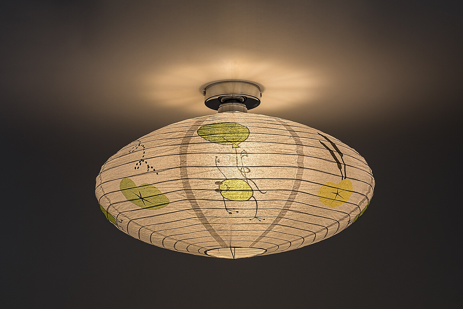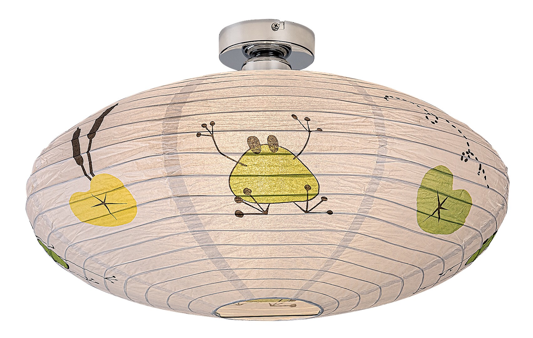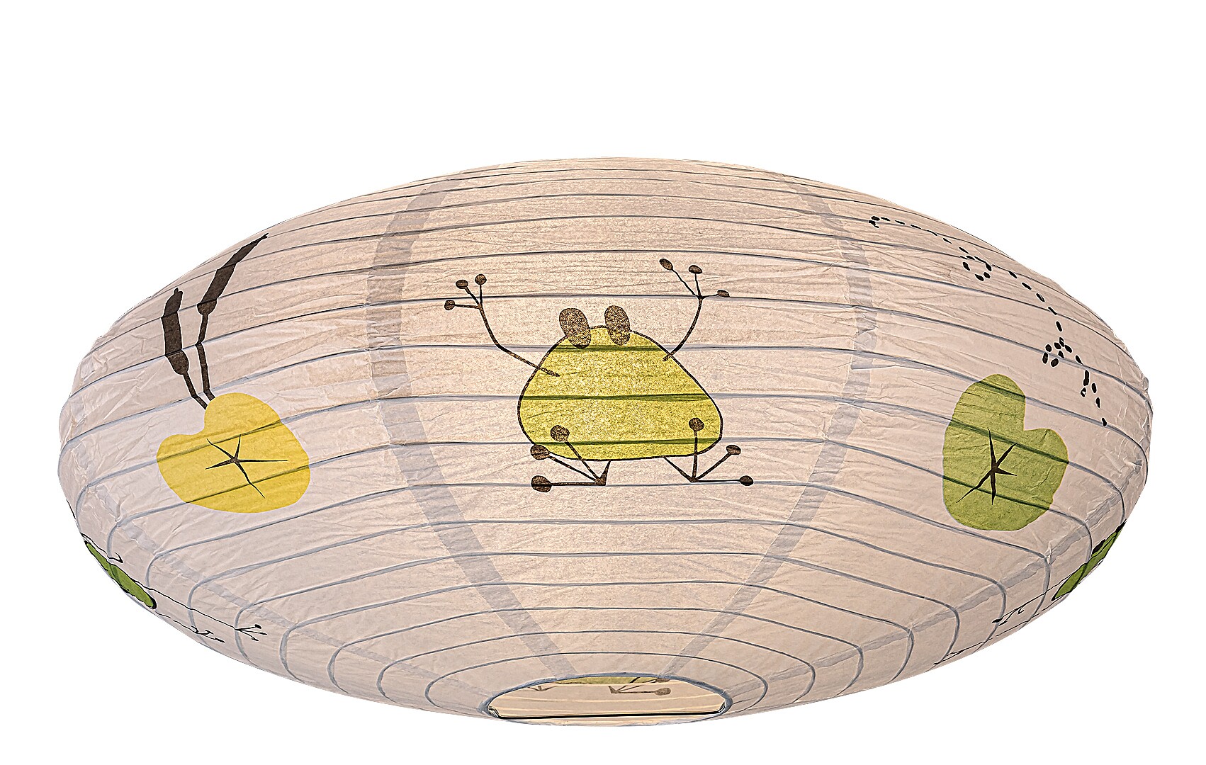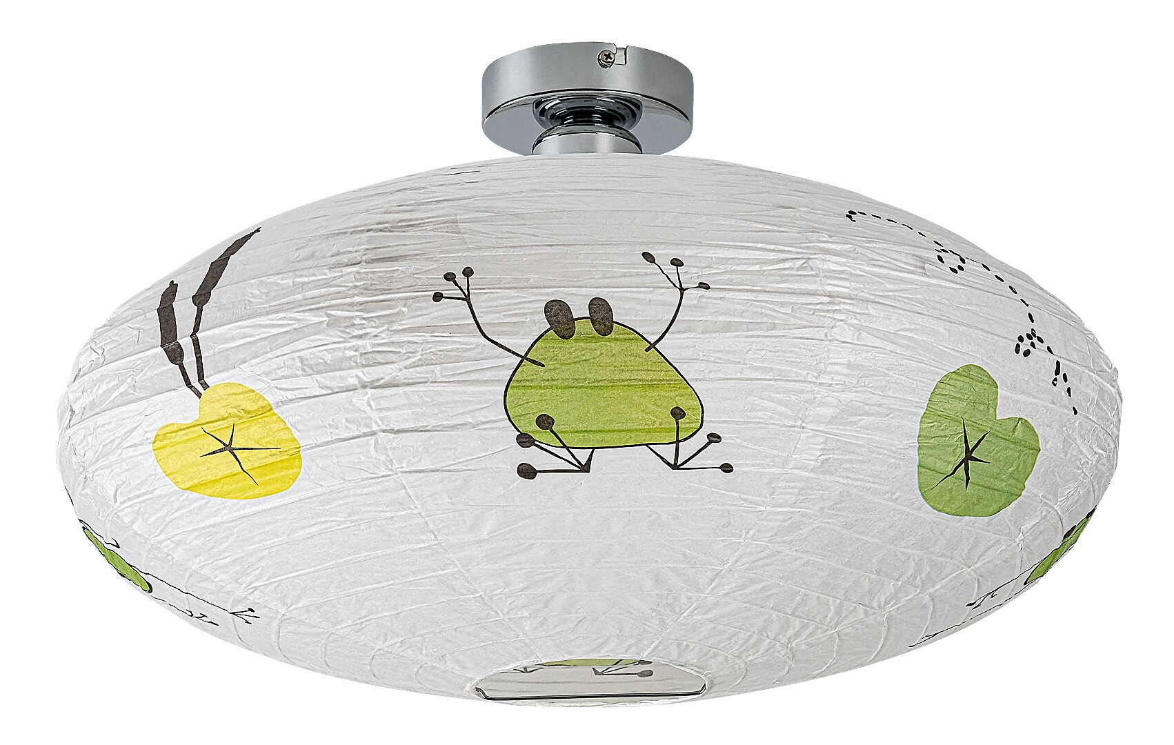Die Rabalux Froggo Papier-Deckenleuchte für Kinder ist ein eigenes Designmodell von Rabalux. Sie ist ideal für alle, die dem Kinderzimmer ein fröhliches, verspieltes Motiv hinzufügen möchten. Die Lampe hat eine abgeflachte, abgerundete Form, besteht aus Papier und ist mit einem lustigen Frosch- und Ballonmuster verziert, das garantiert ein Lächeln auf das Gesicht des Kindes zaubert. Die typischen Farben der Motive sind Grün und Gelb, die mit ihrer Frische und Fröhlichkeit für eine angenehme Atmosphäre sorgen.Die Kinderzimmerlampe kann mit einer einzelnen Glühbirne mit einer Leistung von bis zu 40 W verwendet werden. Für eine gemütliche, intime Atmosphäre empfiehlt sich eine Glühbirne mit warmweißem Licht. Die Kinder-Deckenleuchte wird ohne Fassung und Lichtquelle geliefert.