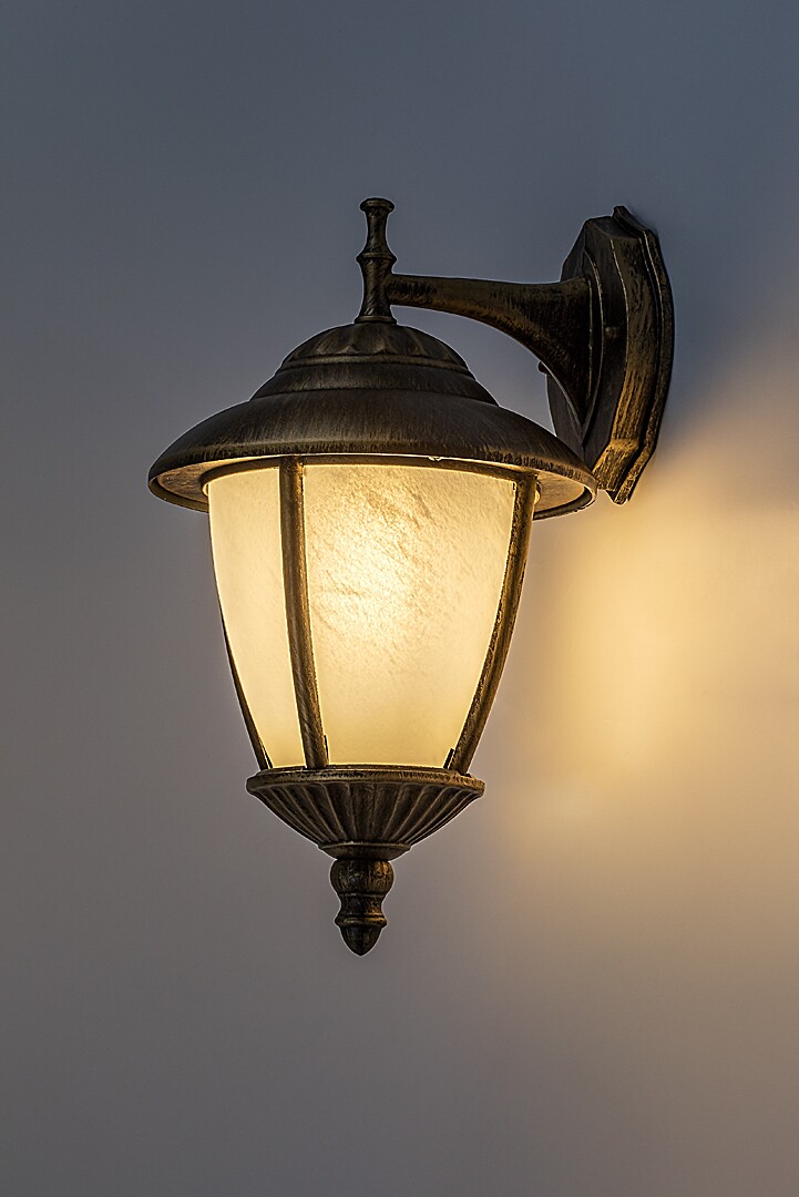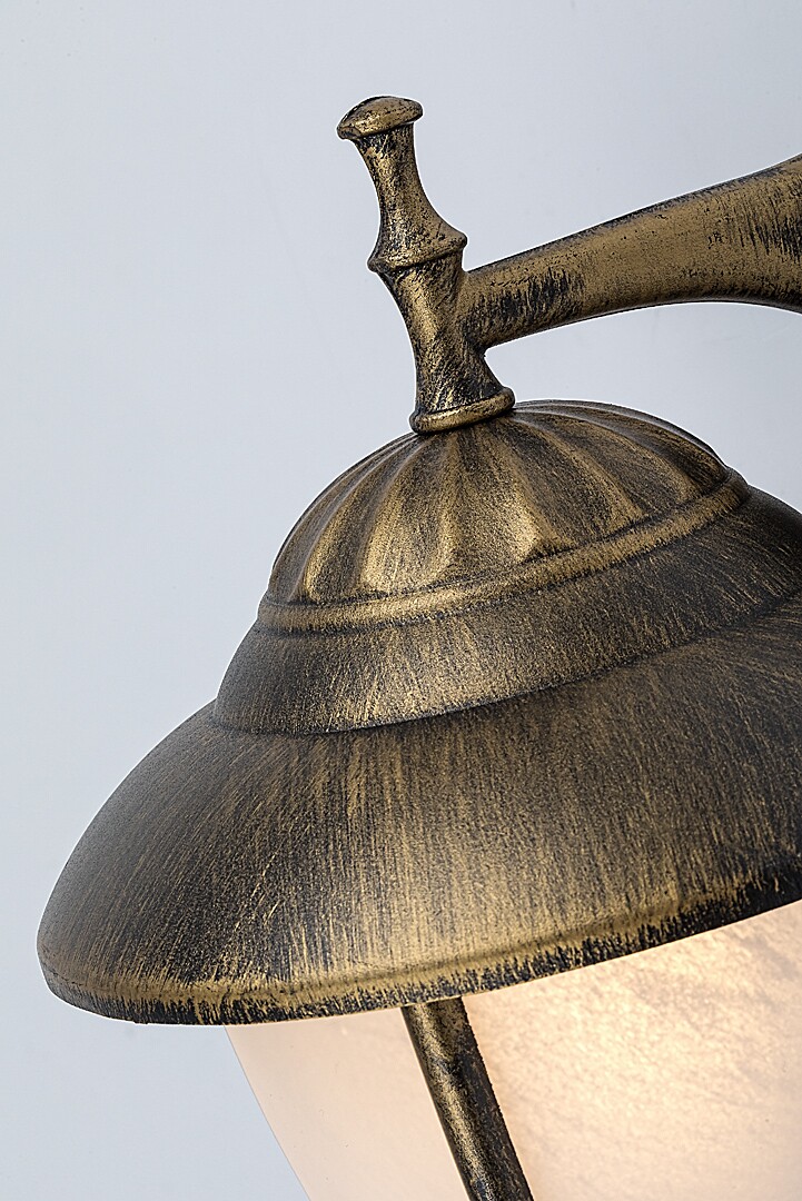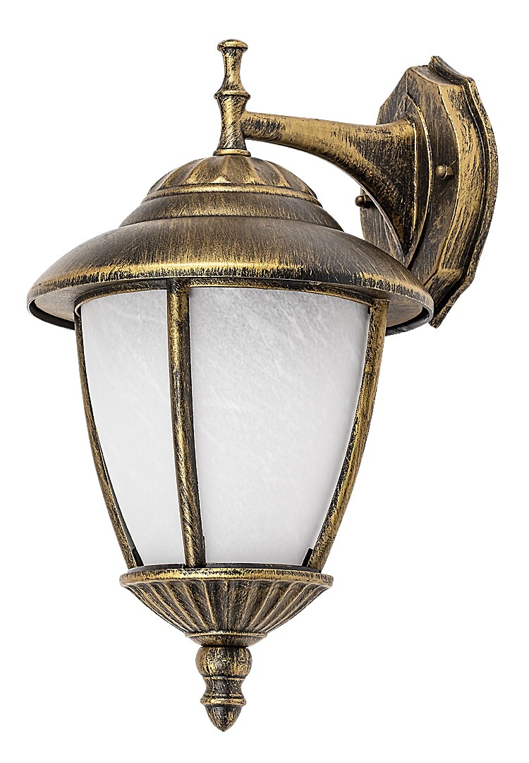 Eine Wandleuchte für den Außenbereich im klassischen Stil mit 1 Fassung. Die 37 cm hohe, antik-goldfarbene Metallleuchte mit einer maximalen Länge von 23,5 cm hat einen Lampenschirm aus weißem Alabasterglas und die Schutzart IP43. Die Leuchte kann mit einem Leuchtmittel bis 60W, Fassung E27, betrieben werden.