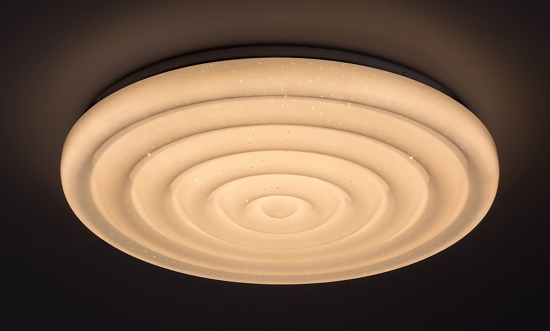 Die runde Deckenleuchte Katina, die mit einem Glitzereffekt versehen wurde, wird denjenigen empfohlen, die ein Modell in ihr modernes Wohn- oder Schlafzimmer suchen, das durch ein zurückhaltendes Aussehen geprägt ist, zugleich Extra-Funktionen bietet. Dank ihrer weißen Farbe paßt sich die Lampe fast unmerklich an die typischerweise helle Farbe der Decke an. Die aus Metall gefertigte Katina ist durch eine Kunststoffabdeckung ergänzt, und hat eine eingebaute LED-Lichtquelle von der Energieeffizienzklasse F mit einer Leistungsaufnahme von 36 W, einem Lichtstrom von 3070 Lumen mit Abdeckung und 3600 Lumen ohne Abdeckung, und einer Lebensdauer, die wirklich fantastisch ist: 50.000 Stunden! Die Farbtemperatur der Lampe kann zwischen 3000 und 6500 K eingestellt werden, sie kann also warm-, neutral- oder kaltweißes Licht abstrahlen. Weitere Extra-Funktionen sind die variable Lichtstärke, die Speicher-, Timer- und Nachtlichtfunktion. Die Farbtemperatur und die Speicherfunktion kann mit einem Schalter oder einer Fernbedienung geregelt werden, während die Lichtstärke und die Timerfunktion mittels einer Fernbedienung eingestellt werden kann. Durchmesser der Deckenleuchte ist 475 mm, Abstand von der Decke beträgt 70 mm.