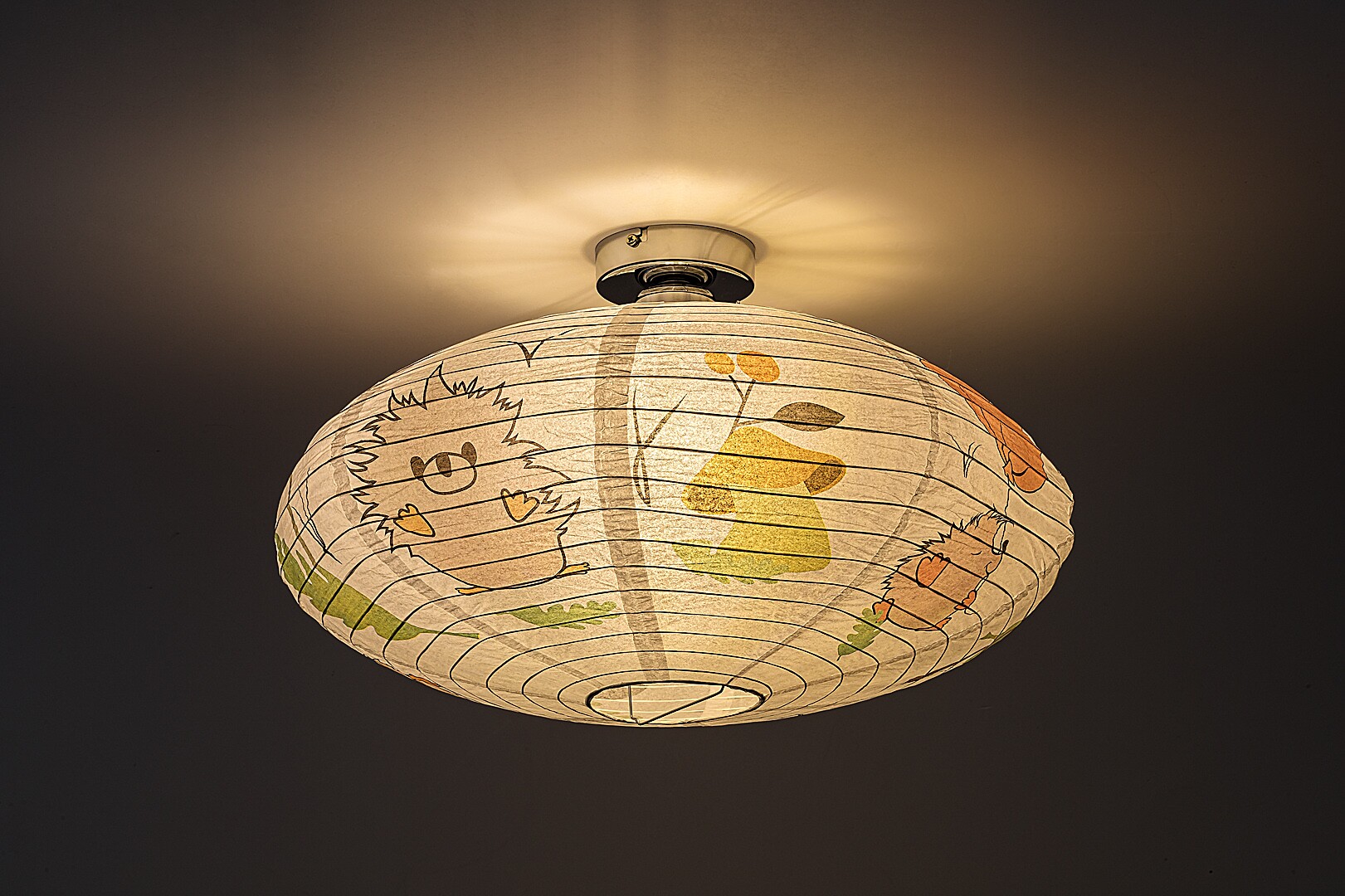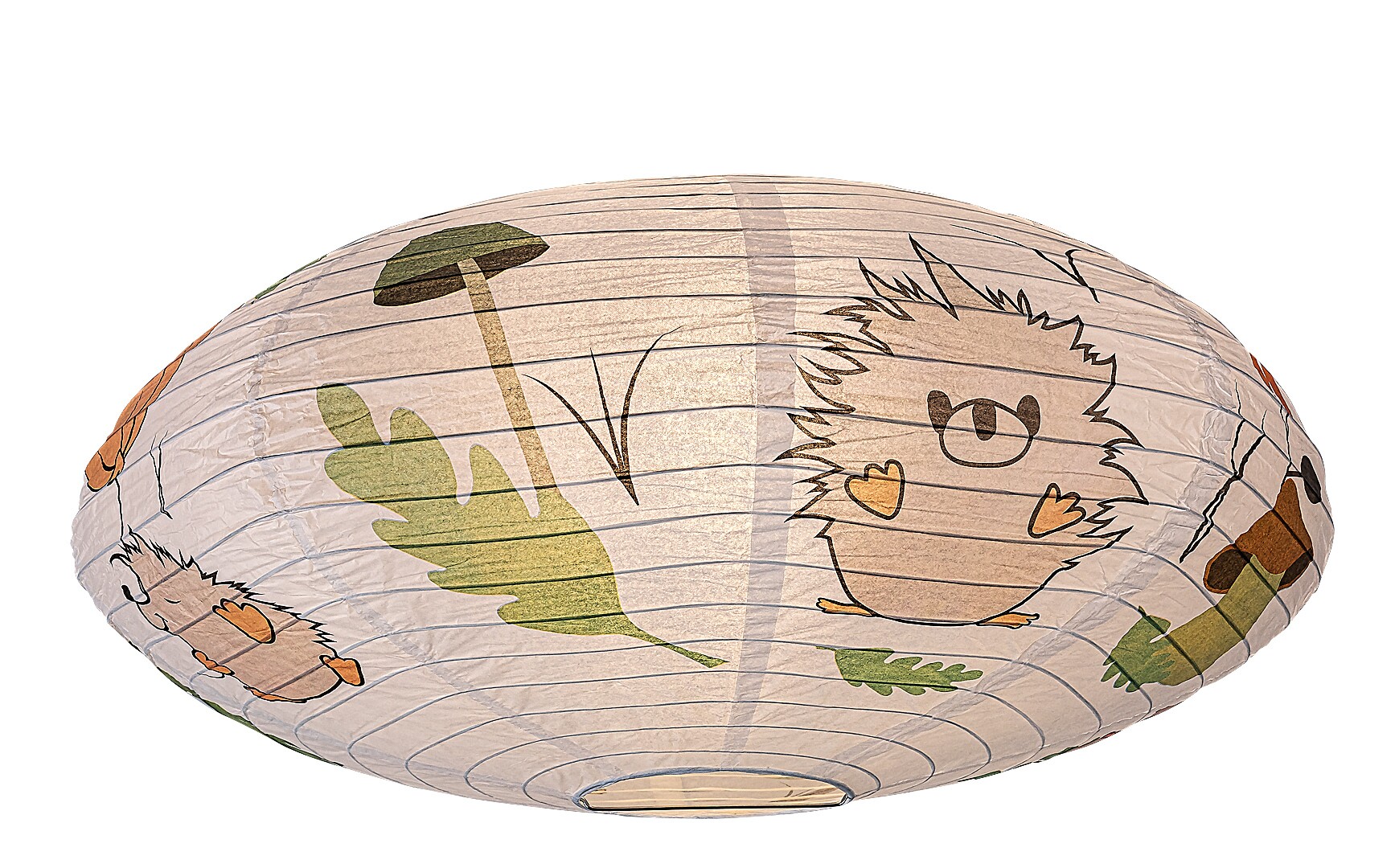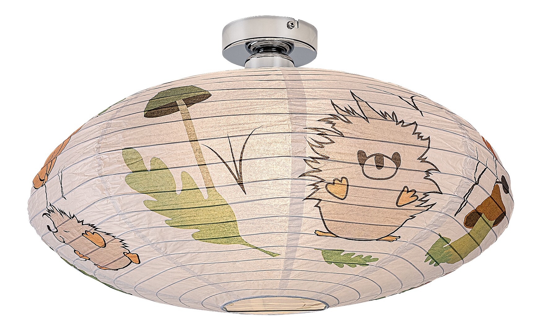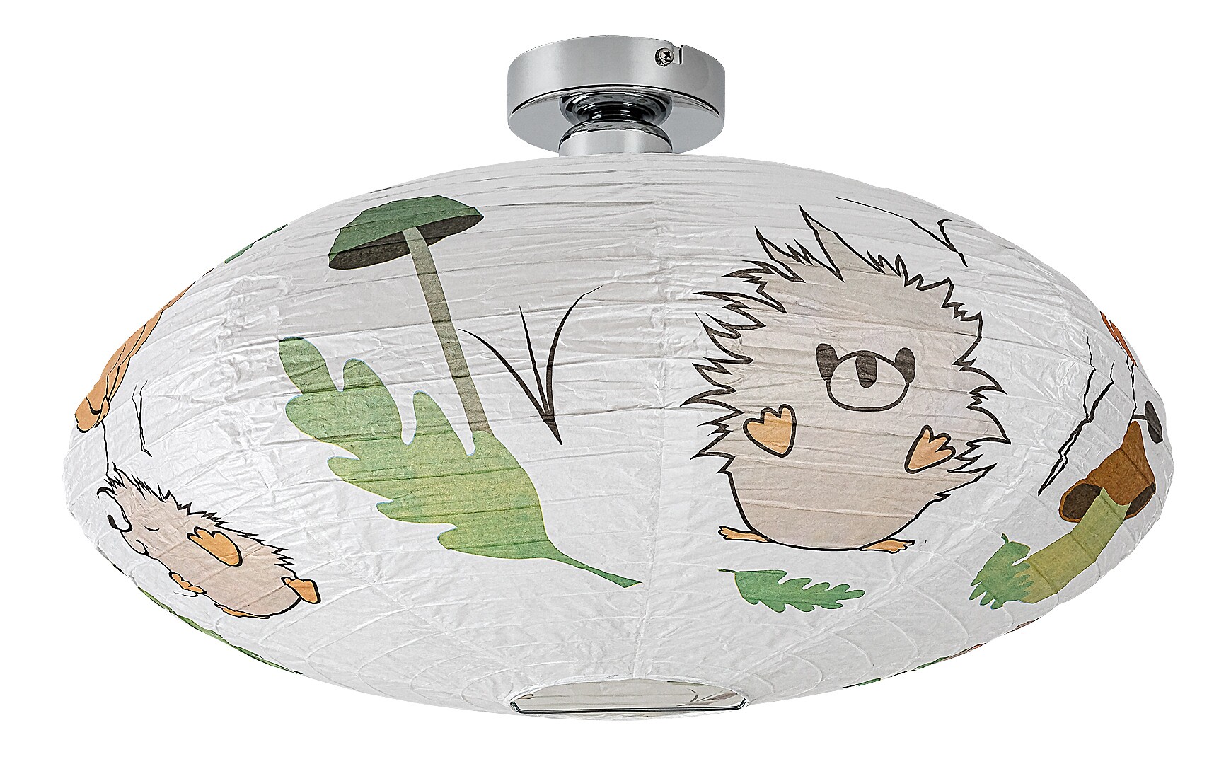 Die Rabalux Hedgy Kinder-Deckenleuchte aus Papier ist ein von Rabalux selbst entworfenes Modell. Sie ist ideal für alle, die das Kinderzimmer mit niedlichen, fröhlichen Motiven noch einladender gestalten möchten. Die Lampe hat eine abgeflachte, runde Form, besteht aus Papier und ist mit einem bezaubernden Igel- und Ballonmuster verziert, das garantiert die Herzen der kleinen Bewohner höherschlagen lässt. Die dominierenden Farben des Motivs sind Orange-, Braun- und Grüntöne, die angenehm für das Auge sind, eine beruhigende Wirkung haben und Wärme ausstrahlen. Die Kinderzimmerlampe kann mit einem einzelnen Leuchtmittel mit einer Leistung von bis zu 40 W verwendet werden. Für eine besonders gemütliche und stimmungsvolle Atmosphäre empfiehlt sich eine Lichtquelle mit warmweißem Licht. Diese Kinderzimmerleuchte wird ohne Fassung und ohne Leuchtmittel geliefert.