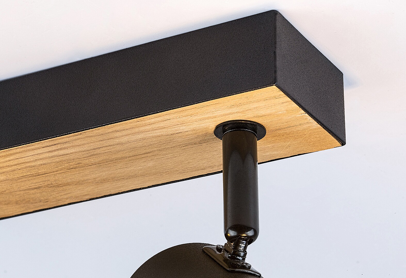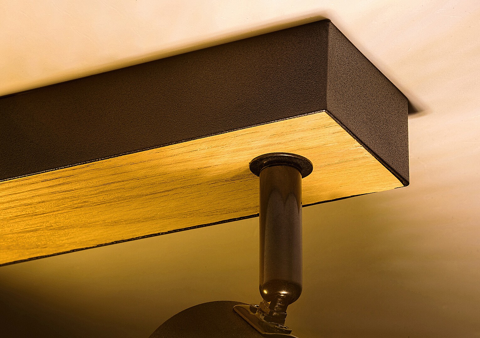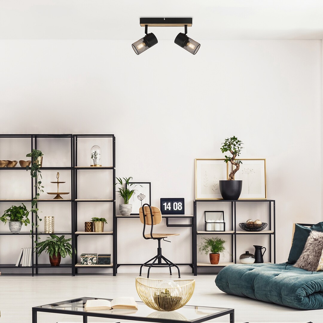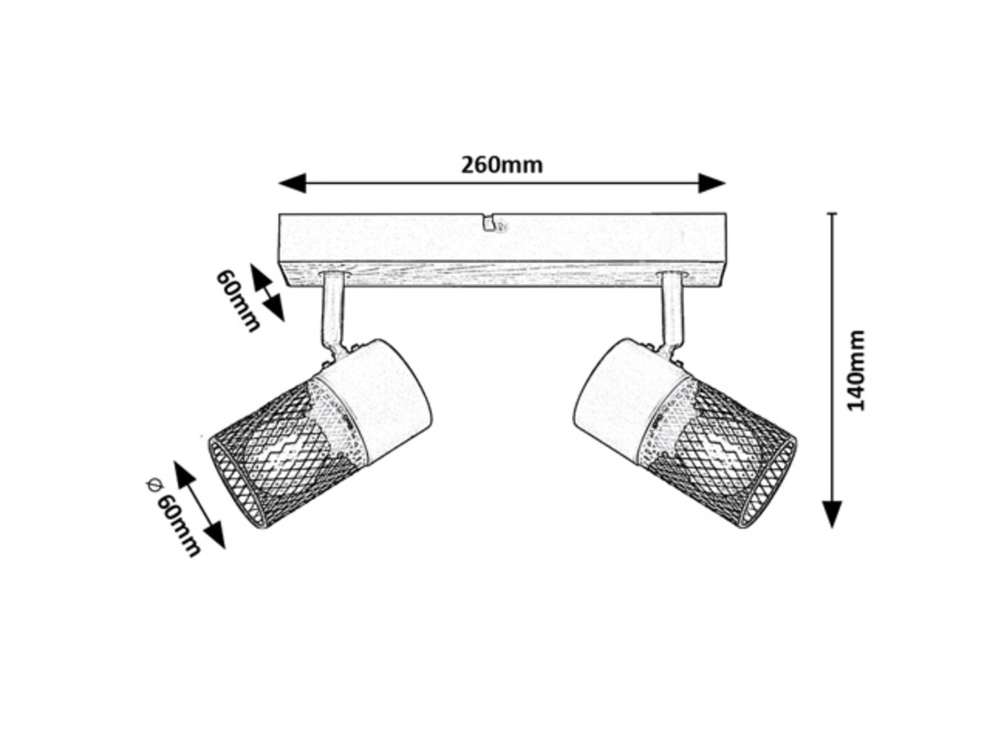 Die 2-flammige Metta Deckenspotleuchte im Industriestil wird insbesondere für das Wohnzimmer oder Schlafzimmer empfohlen. Das Eichenfarbene Modell, das aus Metall und Holz besteht, wird durch zylindrische, schwarze, gitterartige Leuchtenschirme ergänzt, die unten offen sind, und kann mit Hilfe einer länglichen, ovalen dekorativen Basis an der Decke befestigt werden. Dank der flexiblen Leuchtenköpfe, die nebeneinander platziert sind, kann das Licht der Leuchte nach Bedarf ausgerichtet werden. Die Metta kann mit zwei Leuchtmitteln, jeweils mit einer Leistung von bis zu 40 W verwendet werden. Der Sockeltyp ist E14. Je nach Ihren Vorlieben und dem Raum, in dem Sie die Leuchte installieren möchten, können Sie warm- oder natürlichweiße Leuchtmittel wählen. Im Schlafzimmer wird empfohlen, diese Deckenleuchte mit Leuchtmitteln zu verwenden, die warmweißes Licht abgeben, da dies dazu beiträgt, eine gemütliche, intime Atmosphäre zu schaffen. Die 2-flammige Metta Spotleuchte hat folgende Abmessungen: Breite 260 mm, Durchmesser jedes Leuchtenschirms 60 mm, der Abstand der Leuchte von der Decke beträgt 140 mm. Dieses Modell wird ohne Leuchtmittel geliefert.