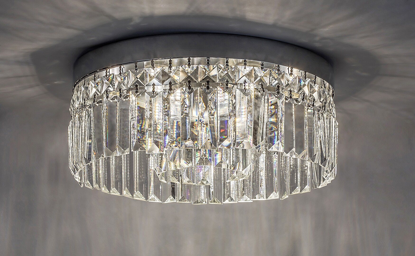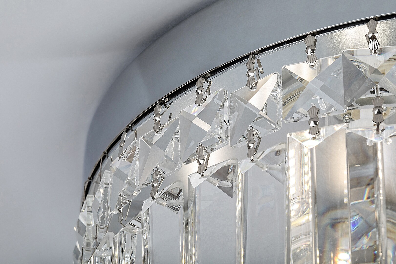 Die elegante, klassische Badezimmer-Deckenleuchte Sybil kann ein elegantes und auffälliges Element Ihrer Badezimmereinrichtung sein. Sie wird vor allem denjenigen empfohlen, die glitzernde, spektakuläre Modelle mögen. Die chromfarbene Metallleuchte wird durch transparente Glasperlen ergänzt, die die Leuchtmittel wie einen Vorhang umhüllen und diesem Modell ein kronleuchterartiges Aussehen verleihen. Die Sybil kann mit Hilfe einer runden, chromfarbenen, dekorativen Basis an der Decke befestigt werden. Die Leuchte kann mit sechs Leuchtmitteln verwendet werden, von denen jedes eine Leistung von bis zu 28 W haben kann. Der Sockeltyp ist G9. Wenn Sie einen reinen, modernen Effekt im Badezimmer erzielen möchten, wird empfohlen, die Leuchte mit Leuchtmitteln zu verwenden, die natürlichweißes Licht ausstrahlen. Der IP44-Schutz der Sybil stellt sicher, dass dieses Modell gegen das Eindringen fester Partikel mit einem Durchmesser von 1 mm oder mehr und gegen Wasserspritzer aus jeder Richtung geschützt ist. Der Durchmesser der Badezimmer-Deckenleuchte beträgt 350 mm, der Abstand von der Decke beträgt 140 mm. Dieses Modell wird ohne Leuchtmittel geliefert.