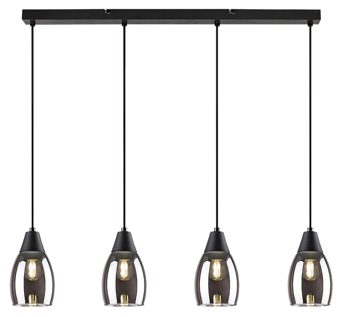 Mit ihrem zurückhaltenden, harmonischen Design kann die 4-flammige Hängeleuchte Ilmari ein elegantes Element vieler moderner Wohnzimmereinrichtungen sein. Die schwarze Metallleuchte wird ergänzt durch getönte Glasschirm, die sich nach unten hin leicht verbreitern und die nach unten offen sind, sowie eine lange, schwarze Dekorbasis. Die Schirme hängen auf gleicher Höhe nebeneinander in einer Reihe. Die Ilmari kann mit vier Leuchtmitteln mit einer Leistung von jeweils bis zu 15 W verwendet werden. Der Sockeltyp ist E27. Da die Hängeleuchte vor allem für das Wohnzimmer empfohlen wird, schlagen wir vor, sie mit Leuchtmitteln zu verwenden, die natürlich weißes Licht ausstrahlen und so einen modernen, reinen Effekt erzielen. Da die Leuchtmittel auch durch die getönten Glasschirme gut sichtbar sind, können Sie das Aussehen dieser Hängeleuchte noch aufregender gestalten, indem Sie Leuchtmittel mit einer unkonventionellen Form verwenden. Die Leuchte hat die folgenden Abmessungen: Breite 720 mm, Durchmesser jedes Lampenschirms 100 mm, Abstand von der Decke 1.200 mm. Die 4-flammige Hängeleuchte Ilmari wird ohne Leuchtmittel geliefert.